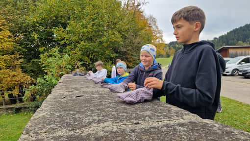 Es ist der Morgen des 8. Oktober. Der Wetterbericht hat kaltes, feuchtes und gegen Mittag sogar nasses Oktoberwetter vorhergesagt. Doch echte Pilger hält dies nicht ab. Und so treffen sich am Samstag den 8. Oktober in fünf verschiedenen Orten (Schöllang, Langenwang, Obermaiselstein, Bolsterlang und Ofterschwang) über fünfzig Familien zum ökumenischen Familienpilgertag, zu dem die katholische und evangelische Kirche die Gläubigen in der PG Hörnerdörfer eingeladen hat. Da ein Pilgerstecken zu einem echten Pilger dazugehört, dürfen sich die Familien am Beginn erst einmal ihren Familienpilgerstecken aussuchen, den sie dann nach ihren Vorstellungen gemeinsam verzieren; da werden z. B. die Initialen der Familienmitglieder eingeritzt, der Stecken mit Zweigen geschmückt oder mit verschiedenfarbigen Wollfäden verziert. Auch das Pilgerkreuz, welches abwechselnd von Kindern vor unserer Gruppe hergetragen wird, wird noch liebevoll zusammengebunden und mit Blumen geschmückt. Nach dem Psalm vom guten Hirten und einem Pilgergebet geht es das erste Wegstück Richtung Fischen. Die Jakobsmuschel als Pilgerzeichen steht beim ersten Halt im Mittelpunkt. Hier erfahren die Kinder wie auch die Erwachsenen welche Bedeutung die Jakobsmuschel für die Pilger hatte und hat und woher dieser Brauch kommt. Stolz binden dann die Kinder jeweils eine Jakobsmuschel an ihren Familienpilgerstecken. Bei der nächsten Station steht der Heilige Jakobus im Mittelpunkt zu dessen Grab jährlich Millionen Menschen bis nach Santiago de Compostella pilgern. Was „pilgern“ heißt und warum sich viele Menschen auf einen Pilgerweg machen, dem spüren die Pilger beim letzten Halt auf dem Weg Richtung Fischen nach. Als wir uns dem Ortsrand Fischen nähern hören wir schon die Kirchenglocken die die Pilger in Fischen lautstark empfangen. Stolz holen sich die Kinder ihren Pilgerstempel, der eine Jakobsmuschel zeigt, ab. Dass es bei der anschließenden Abschlussandacht mit P. Joshy und Pfarrerin Susanne Ohr kräftig zu regnen beginnt, scheint die Pilger wenig zu stören. Aufmerksam hören die Kinder die Geschichte „Vom Geheimnis der Muschel“, freuen sich über die Perle, die ein Sinnbild für sie selbst ist, und machen begeistert bei den Bewegungsliedern mit, die von Thomas Kroll musikalisch begleitet werden.